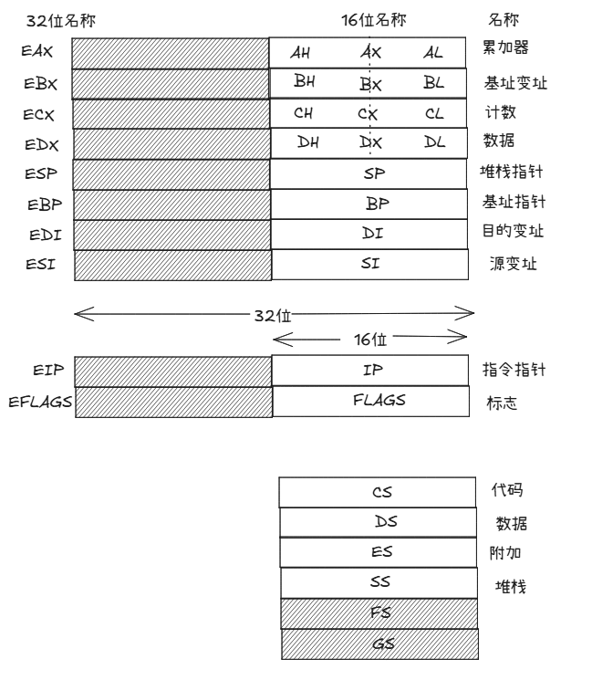 - 数据寄存器:AX(accumulator)、BX(base)、CX(count)、DX(data)