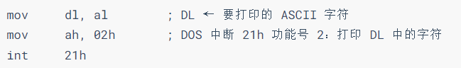 1 | MOV AH, 2 ; AH存入子功能号2 |