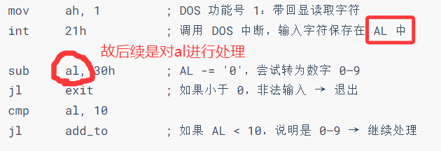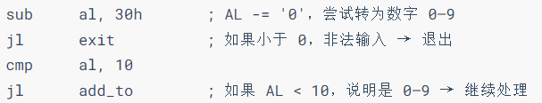 - 首先我们从屏幕输入的都是ASCII,比如输入的是’0’,实际上al中的十进制值是48,故减去48以使其范围落到数值0-9(若不是后续判断)